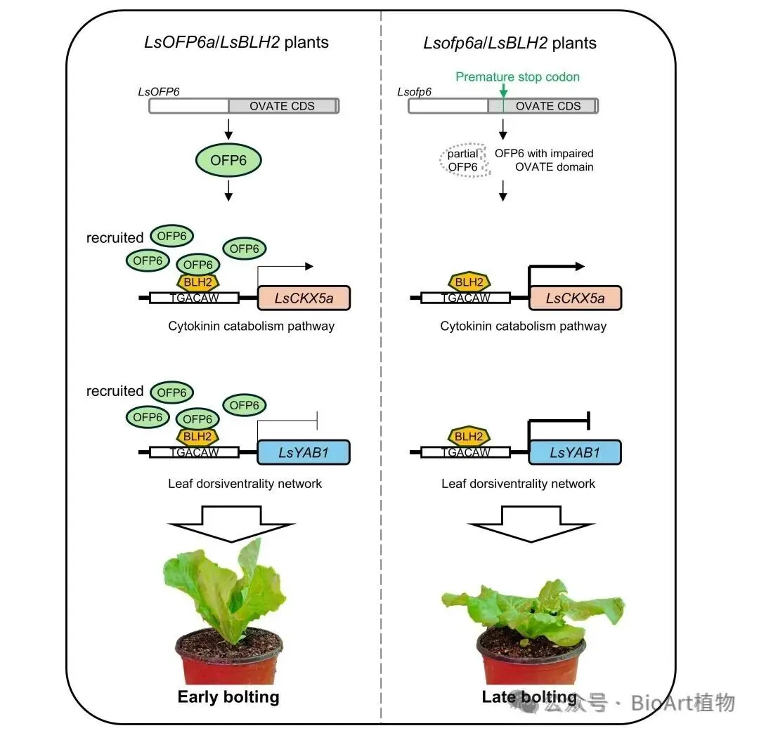 在分子机理层面,研究揭示了一条此前尚未被报道的双通路协同调控网络。LsOFP6a可与转录因子LsBLH2发生蛋白互作,并抑制其对下游靶基因的转录活性。一方面,LsOFP6a干扰LsBLH2对细胞分裂素氧化酶基因LsCKX5的转录激活作用,从而提高叶片中细胞分裂素水平,抑制叶夹角过度开展;另一方面,LsOFP6a解除了LsBLH2对远轴发育关键因子LsYAB1的转录抑制,促进远轴细胞伸长,使叶片姿态更趋直立。两条路径协同作用,精准塑造生菜的紧凑株型(图3)。
