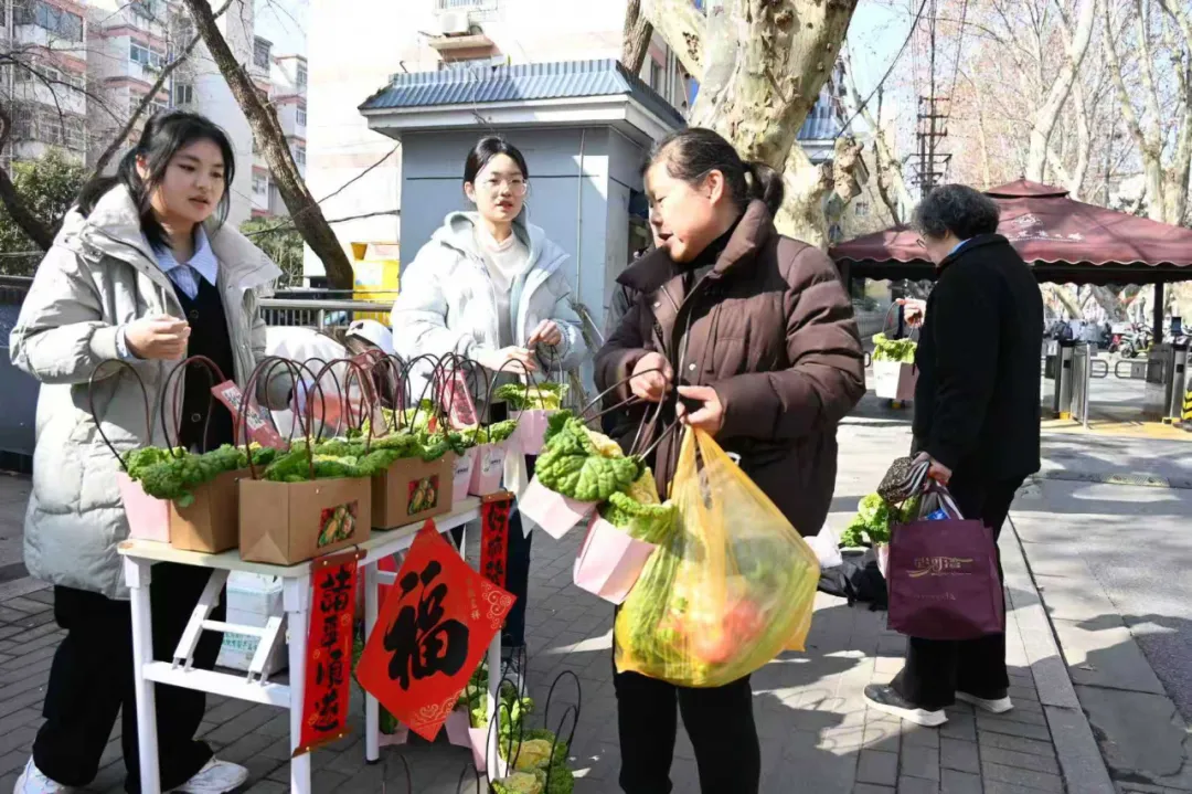 当新春邂逅情人节,双节交汇,福意更浓。2月14日上午,由园艺学院与金融学院学生组成的“金玉”百财团队在卫岗校区开展了一场别开生面的新春活动。活动以学校自主培育的特色农科成果——黄玫瑰白菜为载体,将吉祥寓意与健康理念巧妙融合,为全校师生送上了一份独特而温馨的节日祝福。