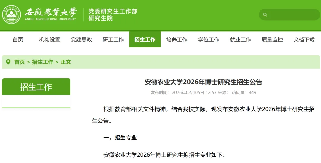 根据教育部相关文件精神,结合我校实际,现发布安徽农业大学2026年博士研究生招生公告。