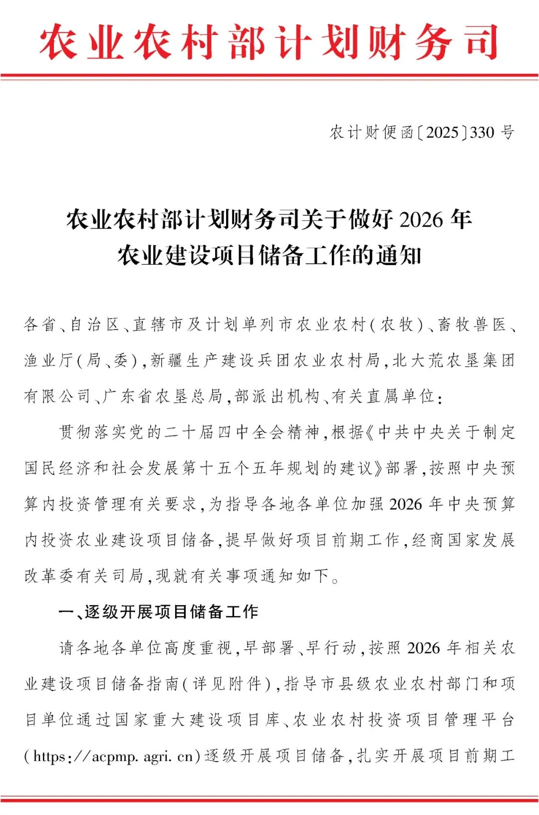 《农业农村部计划财务司关于做好2026年农业建设项目储备工作的通知》及储备指南