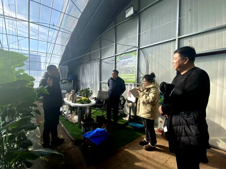 工作组首先抵达衙门台设施农业园区。该园区现有冷棚40栋、温室5栋,目前冷棚处于休棚期,温室主要种植黄瓜、番茄、辣椒等品种,产品以供应本地市场为主。据园区负责人介绍,当前收益良好,甚至连黄瓜疏果时摘下的幼瓜也能以较高价格出售,种植效益显著,计划年内新增7栋温室。工作组实地查看了温室保温性能、结构安全状况及环境调控设施运行情况,并与园区负责人就种植品种选择、茬口安排、产销对接等方面进行了交流探讨。
