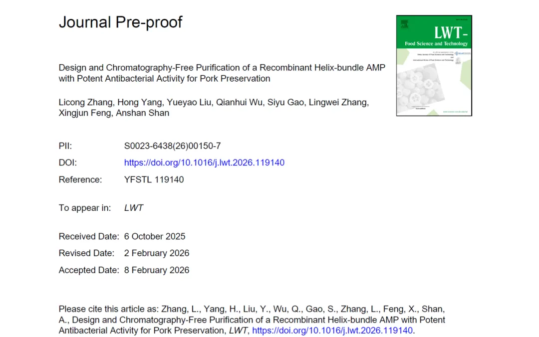 近日,东北农业大学单安山教授的研究团队在食品权威期刊《LWT》(IF=6.6)发表题为“Design and Chromatography-Free Purification of a Recombinant Helix-bundle AMP with Potent Antibacterial Activity for Pork Preservation”的研究性论文。该论文由东北农业大学动物科学技术学院完成,单安山教授和冯兴军副研究员为该论文的通讯作者。