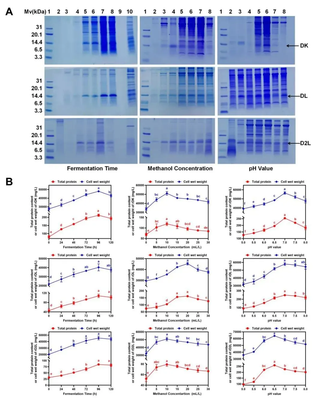 图1(A) 通过Tricine-SDS-PAGE分析时间、诱导剂和pH值对发酵的影响。(B) 分析时间、诱导剂和pH值对总蛋白质和细胞湿重影响。数据为平均值±标准差,n=3。