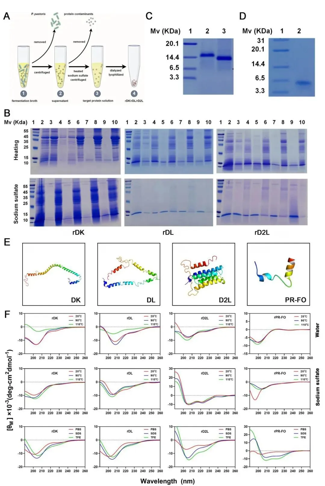 图2(A) DAMP4修饰的抗菌肽纯化流程图。(B) 经加热/盐析纯化的DK、DL和D2L经SDS-PAGE分析。(C)、(D) 经肠激酶切割的DK和rPR-FO经Tricine-SDS-PAGE分析。(E) DK、DL、D2L和PR-FO的三级结构投影。(F) 重组DK、DL、D2L和PR-FO的圆二色性光谱。