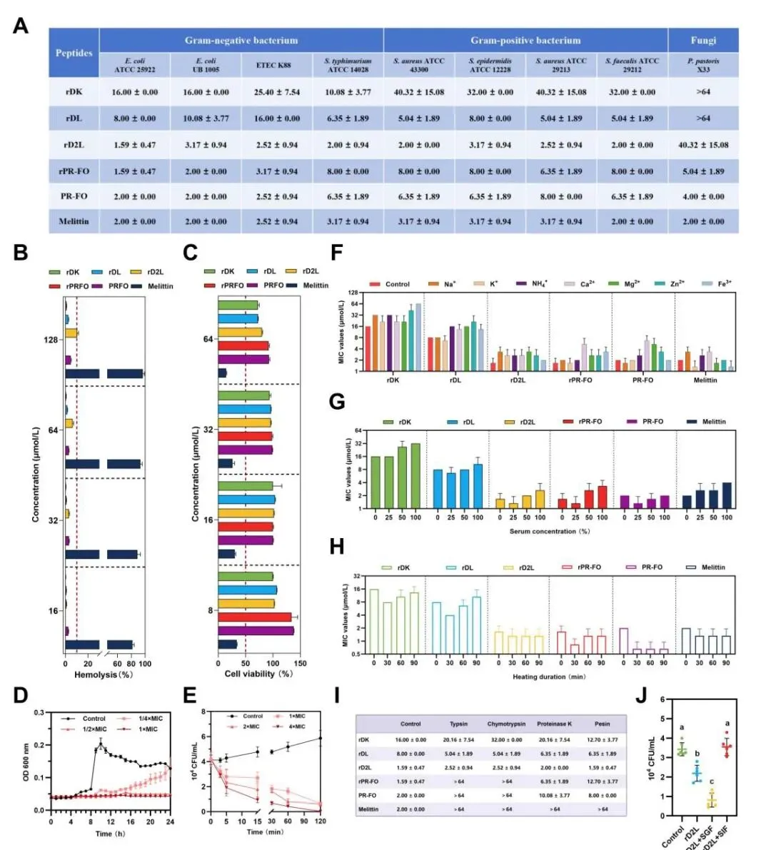 图3 DK、DL、D2L和PR-FO在体外实验中的生物活性测定。(A) 抗菌肽最小抑菌浓度值(μmol/L)。(B) 对人红细胞的溶血活性。(C) 采用MTT法测定对Caco-2细胞的细胞毒性。大肠杆菌ATCC 25922在rD2L作用下的生长曲线(D)与时间杀菌曲线(E)。生理盐水(F)、血清(G)、热稳定性(H)及蛋白酶稳定性(I)条件下,抗菌肽对大肠杆菌ATCC 25922的最小抑菌浓度(μmol/L)。(J) 经SGF和SIF处理的rD2L对大肠杆菌ATCC 25922的抗菌活性(n=6)。