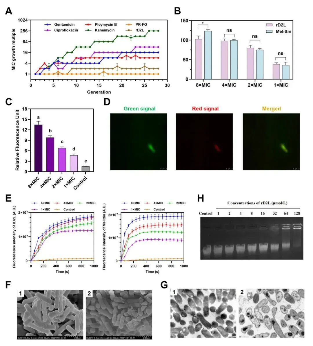 图4 rD2L的抗菌机制。(A) 大肠杆菌ATCC 25922对rD2L产生耐药性的发展过程。数据为均值±标准差,n=3。(B) rD2L处理后通过NPN检测的外膜通透性。数据为均值±标准差,n=3。*表示根据双尾学生t检验,P < 0.05。(C) rD2L对大肠杆菌ATCC 25922细胞膜完整性的影响。数据为均值±标准差,n=3。不同字母表示显著差异(LSD检验,P<0.05)。(D) 采用FITC标记rD2L及核酸染料PI对大肠杆菌ATCC 25922进行处理后的共聚焦激光扫描显微镜观察。数据为均值±标准差,n=3。(E) 经rD2L和蜂毒处理后,采用DiSC3-5检测的细胞质膜电位变化。(F) 经rD2L处理后大肠杆菌的扫描电子显微镜图像;(G) 经rD2L处理后大肠杆菌的透射电子显微镜图像。1:未处理大肠杆菌;2:经rD2L处理。(H) 凝胶滞留法测定rD2L的DNA结合能力。