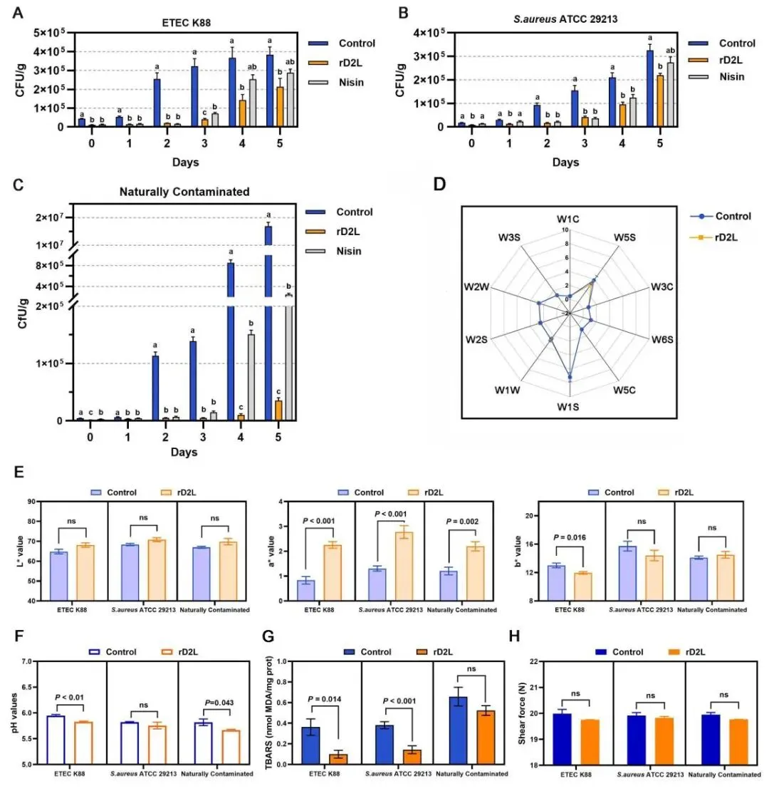 图5 rD2L在猪肉储存中的抗菌功效(n=6)。涂覆(A)ETEC K88、(B)金黄色葡萄球菌ATCC 29213及(C)天然污染猪肉样本的总菌落生长情况。数据为均值±标准误。不同字母表示显著差异(LSD检验,P<0.05)。rD2L对猪肉样本风味(D)、色泽(E)、pH值(F)、TBARS值(G)及剪切力(H)的影响。