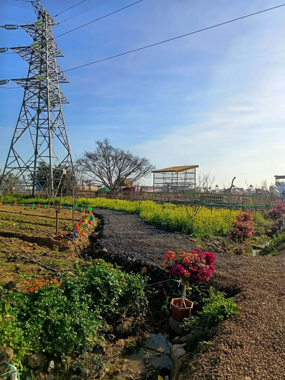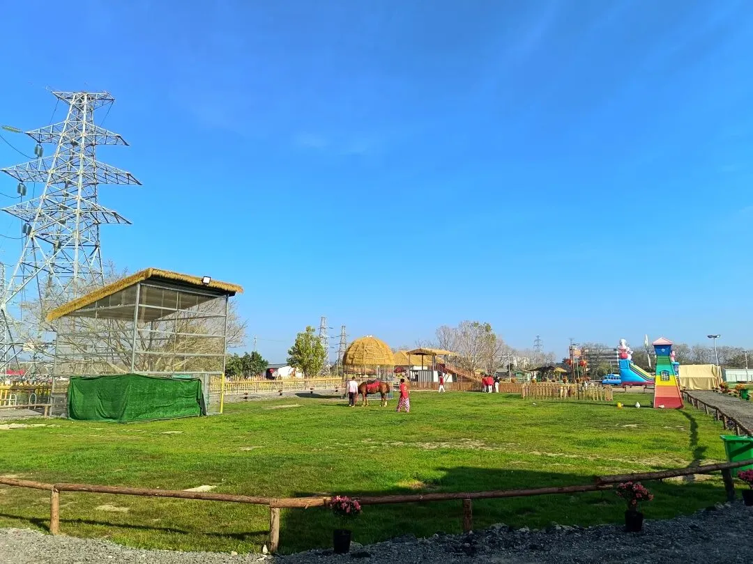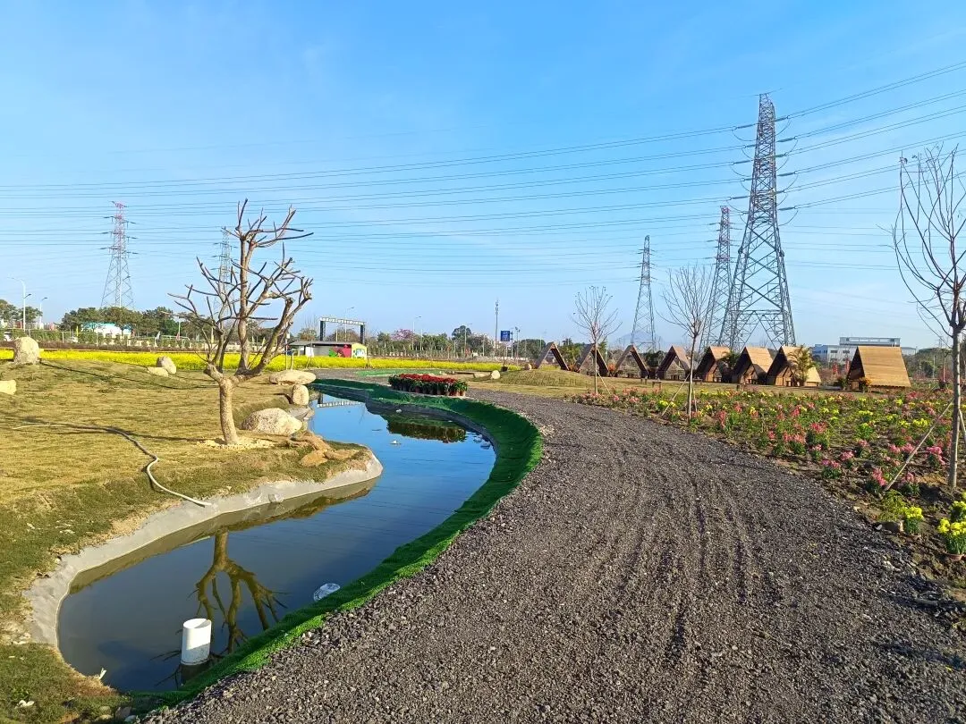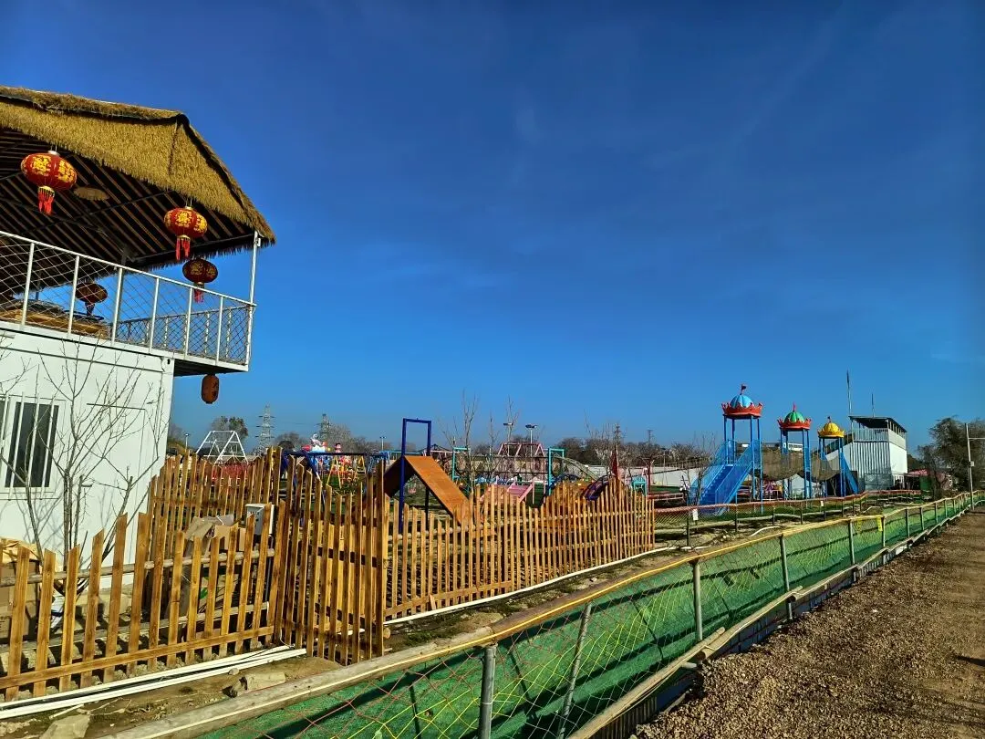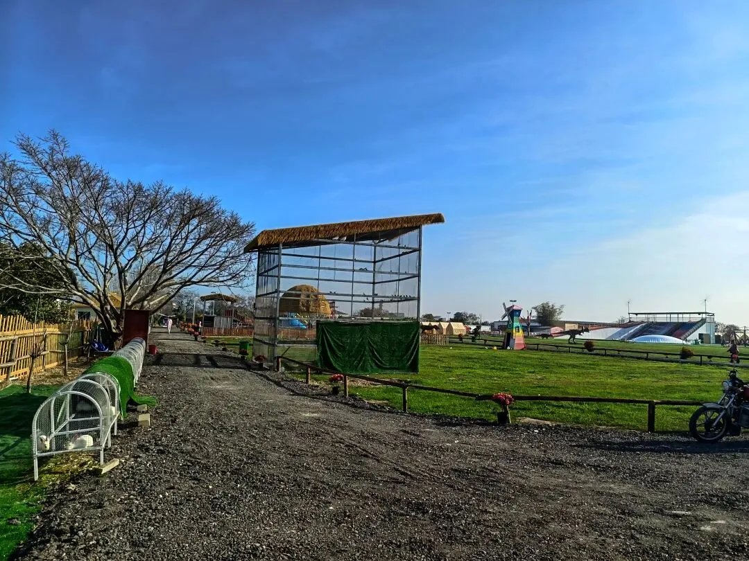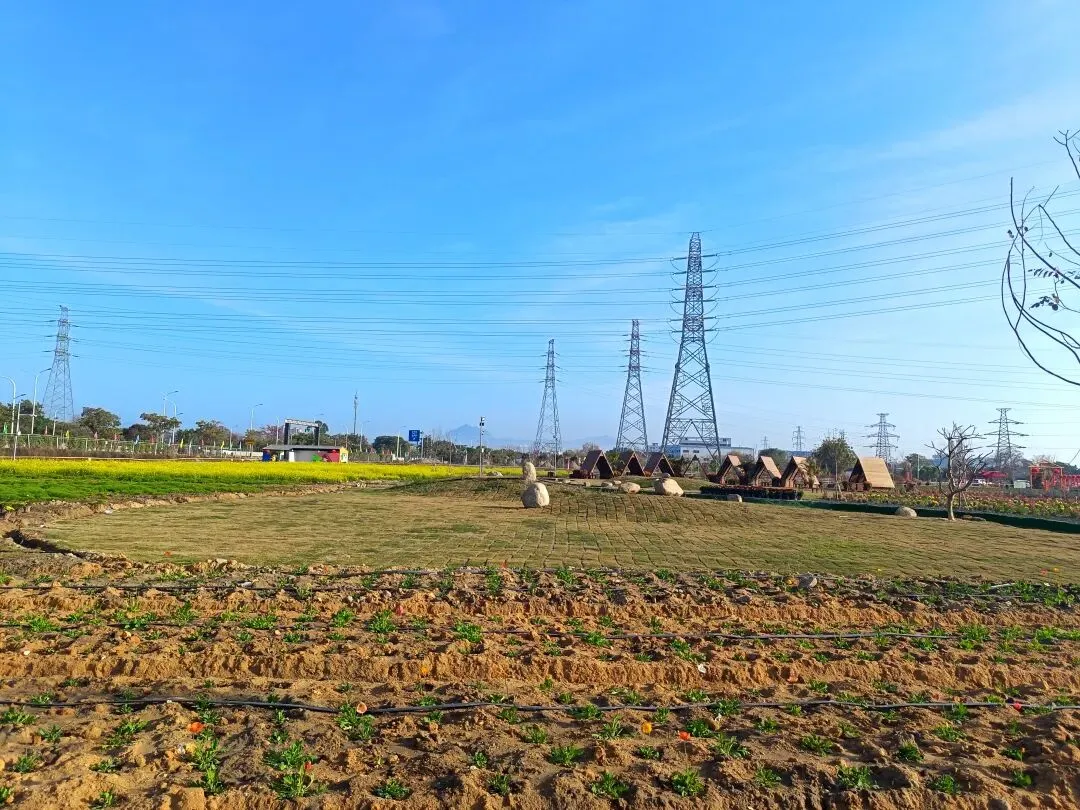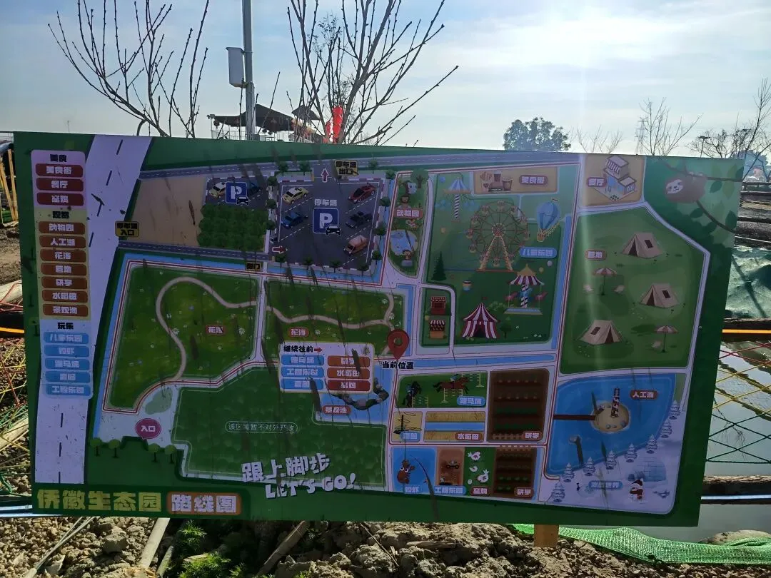 从这开始,基本都是收费项目了,动物园动物不多,鸽子鹦鹉马兔子羊驼等,估计小孩会喜欢吧,收费16.8,游乐园的人员说如果我进去就是第一个人了,没进去。露营区,本巷试开三轮摩托,工作人员还没准备好也不知道操作,只让我扫码,扫出个小程序啥的公司,就没进去下一步操作了,那就等下次再体验吧,园区准备太匆忙待完善。桥的那边是冰雪世界和矮人王国小房子和美食区,没过去,应该也都是收费项目,桥头站会就往回走了,沿途都没有凳子可以休息,也没地方避太阳,太晒了,才早上9点多。冰雪世界那边就没去了,往回走时,碰巧拉布布们和英歌舞潮州大锣鼓表演了,总算值回门票了哈。这里曾是田园牧歌的沃土,电塔阵静立绿洲,草长莺飞,承载着一代人的乡愁记忆。如今路过汕北大道侨徽生态园,见城市扩张、绿洲蜕变,不禁感慨:物换星移,每一代人都有各自的乡愁——我的乡愁在远去,新的乡愁又在孕育。或许多年后,这里也会成为下一代人追忆的"曾经乐园"。正如莱芜沙滩、黄河岸线相继围合,属于大自然的原生之美日渐稀缺,但故土正以另一种方式焕发活力,这便是时代进步的代价与馈赠吧。