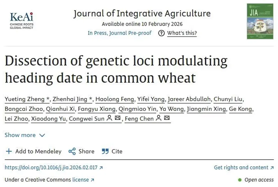 2026年2月10日,河南农业大学农学院陈锋教授团队在Journal of Integrative Agriculture在线发表了题为“Dissection of genetic loci modulating heading date in common wheat”的研究论文。该研究整合基因组、转录组和蛋白组等多维度数据,通过构建小麦全基因组重组景观、GWAS、QTL定位、重要基因eGWAS、翻译后修饰等手段挖掘了抽穗期相关基因并构建了调控网络,为培育气候适应型小麦新品种提供了新见解。