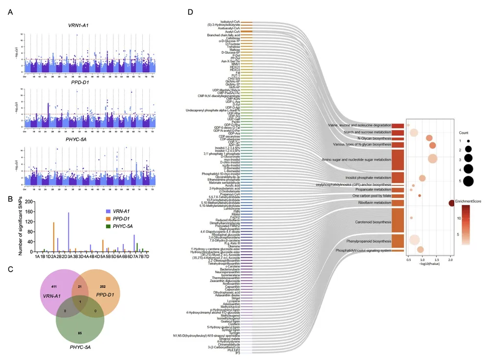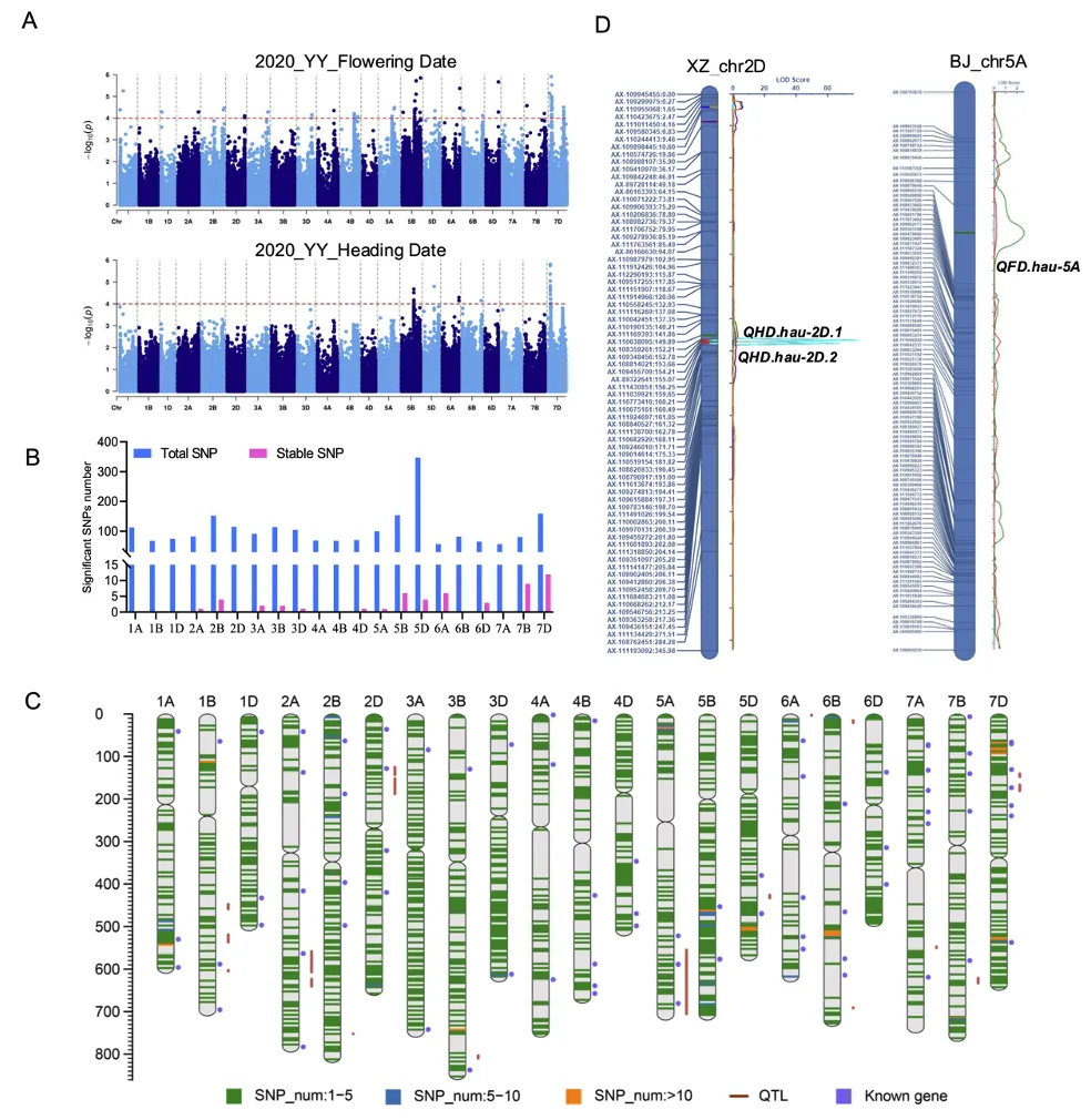 pGWAS(表型关联分析)在多个环境中共鉴定到2223个显著SNP位点,其中53个为至少两个环境中都检测到的稳定SNP,关联13个候选基因。在双亲群体中共定位到21个控制抽穗/开花期的QTL。其中,位于2D染色体上的QHD.hau-2D.1效应最强,可解释高达31.2%的表型变异(图2)。