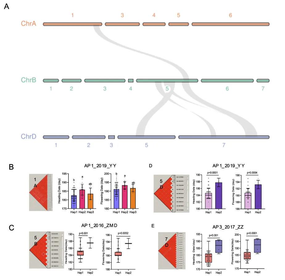 研究进一步对显著区间进行了共线性分析,鉴定到了5对跨染色体的同源区间,并挖掘到了能显著改变抽穗期的优势单倍型。7D_Hap1使抽穗和开花分别提前8.7天和8天,5B_Hap1使抽穗和开花提前3天。这些发现不仅揭示了基因组进化中的保守调控模块,更为分子标记辅助选择提供了具体靶点(图3)。
