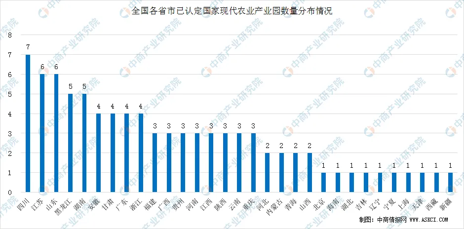在87个国家现代农业产业园中,全国31省市皆有产业园入选。其中四川省经认定的国家现代农业产业园数量最多,目前共有7个;江苏省和山东省分别有6个现代农业产业园被认定为国家现代农业产业园;黑龙江及湖南省各有4个。其余各省市国家现代农业产业园分布如下: