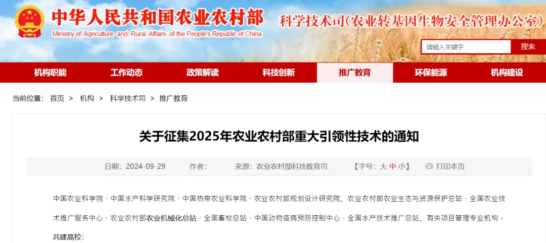 为贯彻落实党的二十届三中全会以及全国科技大会精神,充分发挥科技在引领农业高质量发展中的重要作用,加快先进技术的集成熟化和推广应用,我部决定组织征集2025年农业农村部重大引领性技术。现就有关事项通知如下。