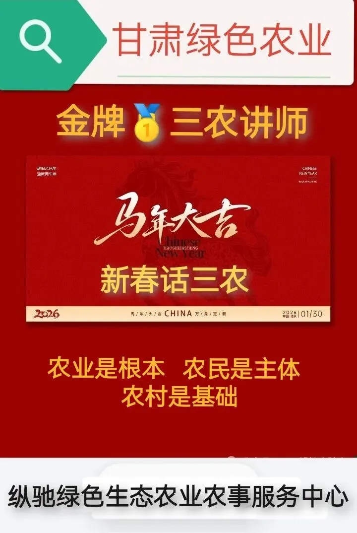 当“马年大吉”的红色背景映入眼帘,当“甘肃绿色农业”的绿底金字跃然纸上,一场关于三农的深度对话正随新春启幕。2026年1月30日,“金牌三农讲师”以铿锵之声宣告:“农业是根本,农民是主体,农村是基础”——这十二字箴言,正是乡村振兴的定盘星!