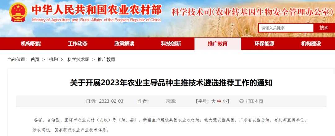 为贯彻落实党的二十大和中央农村工作会议精神,发挥科技对提高粮棉油糖等重要农产品单产的支撑作用,加快当家品种和先进适用技术推广应用,确保粮食生产和重要农产品稳定安全供给,我部决定在全国范围内遴选发布2023年主导品种主推技术。现将有关事项通知如下。