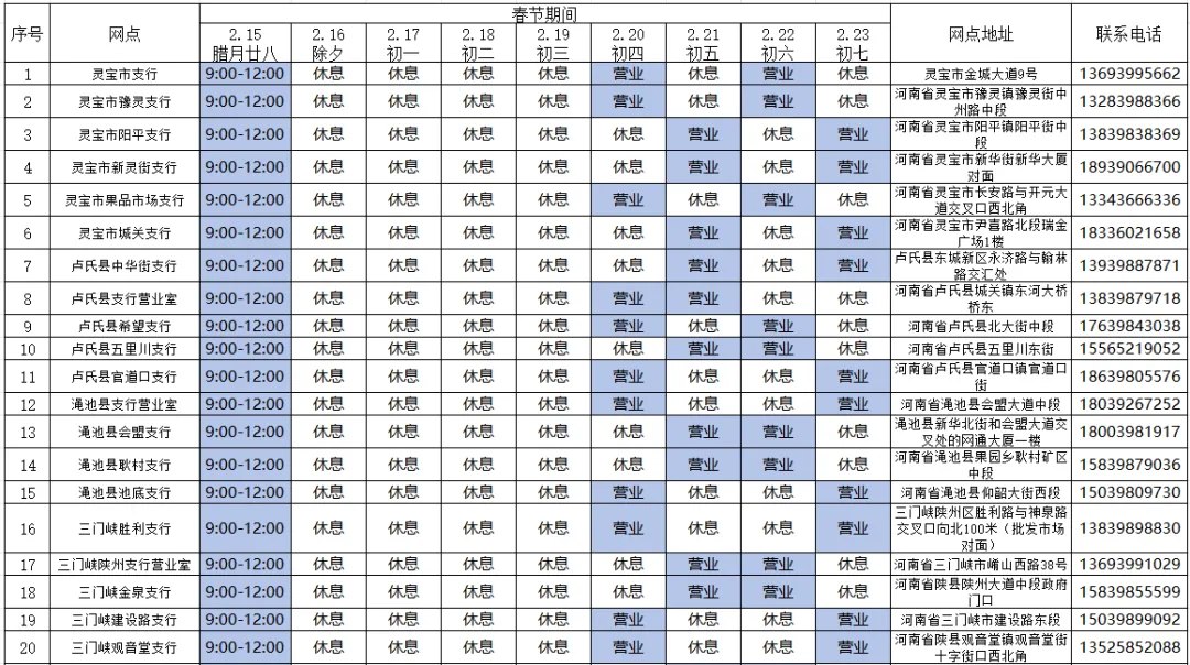 广大市民春节期间办理业务,现将农行三门峡分行春节期间网点营业安排公告如下: