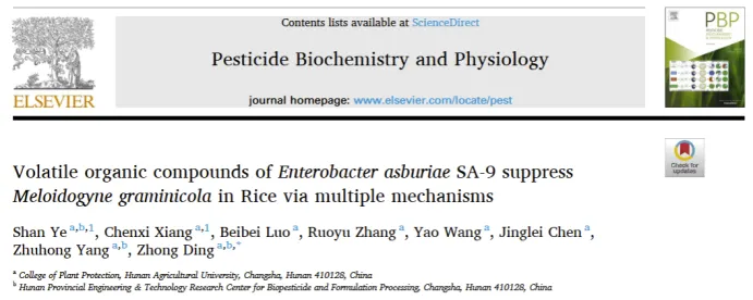 湖南农业大学植物保护学院丁中教授团队在TOP发表科研成果:阿氏肠杆菌SA-9菌株的挥发性有机化合物通过多种机制抑制水稻根结线虫