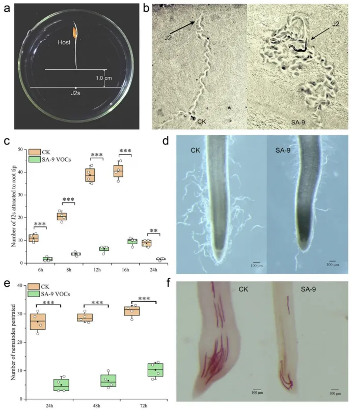采用稀释分离法从水稻根际获得菌株SA-9,结合形态、生化特征及16SrRNA、gyrB基因测序完成菌种鉴定;2.利用三室培养皿开展体外实验,检测SA-9VOCs对线虫J2幼虫的熏蒸毒杀、卵孵化抑制作用,通过趋化实验分析其对线虫趋化行为的影响,并采用qRT-PCR检测线虫关键趋化基因的表达量;3.借助双层盆实验,验证温室条件下SA-9VOCs对水稻根结线虫的防控效果及对水稻的促生作用,同时检测水稻抗病和生长相关基因的表达;4.采用固相微萃取-气相色谱-质谱(SPME-GC-MS)鉴定SA-9的VOCs成分,测定商用纯化合物对线虫的接触和熏蒸杀线活性并计算LC50。