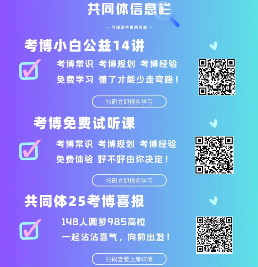 在这个阶段,共同体也有相应的课程,针对你的个人的情况、你报考的方向、你的报考专业来给你进行一个专业性的模考以及这个笔试的复盘。(微信公众号:马理论学术共同体 马理论考博共同体,微信:malilun666)