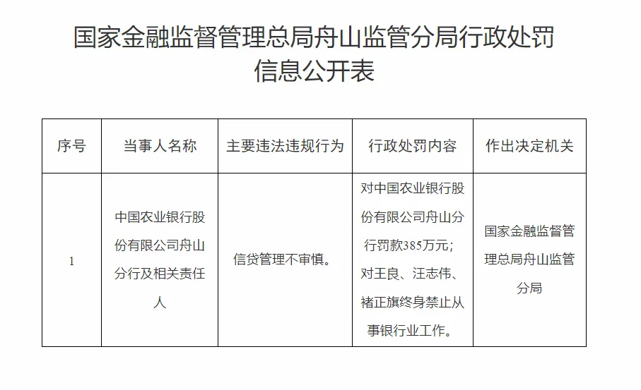 2026年2月13日,国家金融监督管理总局舟山监管分局正式对外发布行政处罚信息,中国农业银行股份有限公司舟山分行(以下简称“农行舟山分行”)因信贷管理不审慎,被处以385万元罚款;