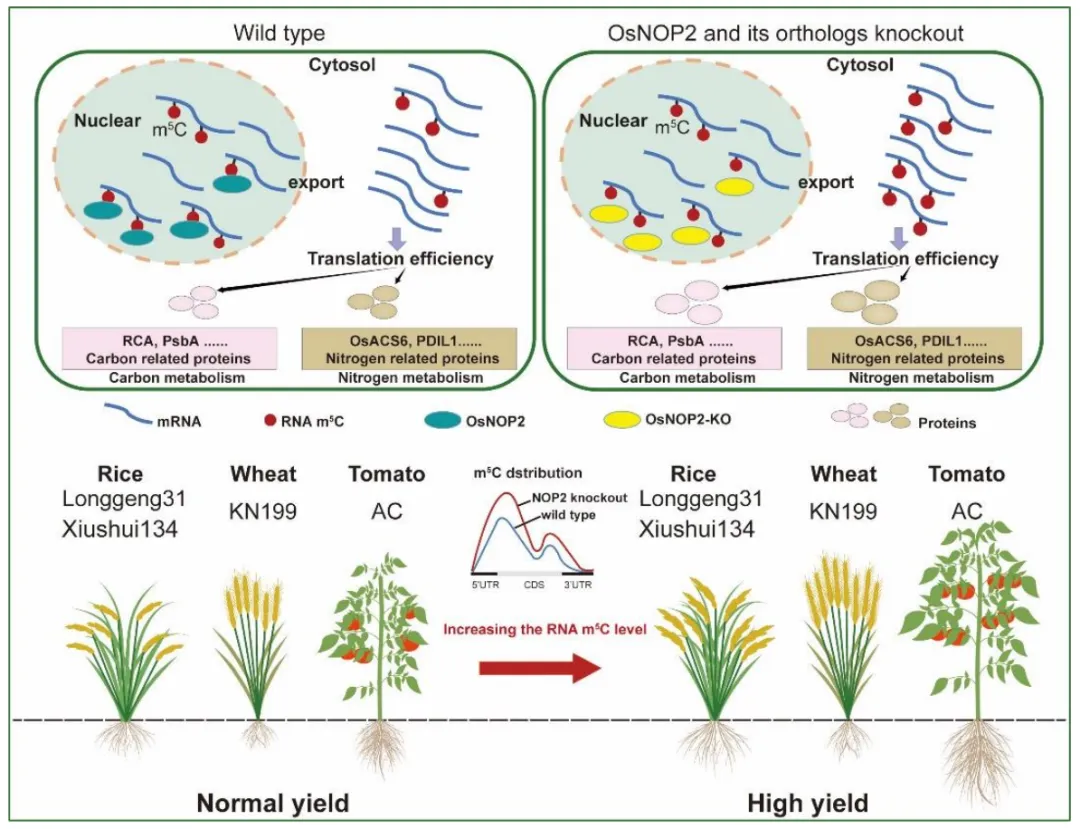 研究人员通过基因编辑手段敲除水稻中的OsNOP2基因,在日本晴、龙粳31、秀水134等多个品种中均观察到RNA m5C整体水平显著上升,并伴随产量提升超过20%。更值得注意的是,OsNOP2功能缺失不仅在常规种植条件下促进增产,在高温胁迫或高盐土壤等逆境环境中也能有效缓解产量损失,展现出优异的环境适应性。进一步实验表明,敲除小麦和番茄中NOP2的同源基因同样带来显著效益:小麦单株产量提高约33%,番茄单果鲜重亦增加近三分之一,充分验证了该调控机制在不同作物中的功能保守性。