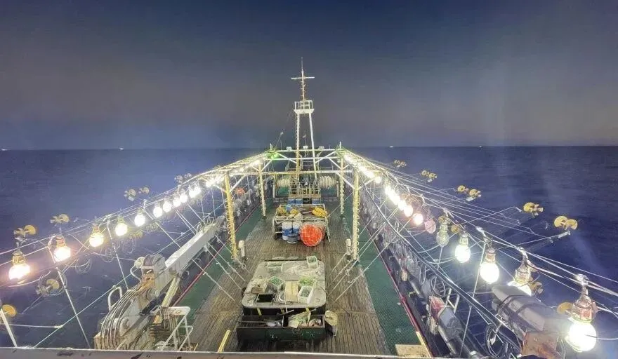 申请与分配 • 申请期:年度,2026捕捞季申请期已于2025年10月设定(具体日期见年度法规)。 • 分配方式:有限许可(通常80-100个左右),优先本地/联合企业,国际船需通过福克兰注册公司申请。 • 主要船队:台湾、韩国、日本鱿钓船(jiggers);西班牙、欧盟拖网船。中国远洋船队极少参与(主要公海作业,无需福克兰许可)。 • 费用:高额,2025年较前一年减5%(Illex许可)。历史单船费用可达数十万英镑,视船型/历史业绩。 • 要求:实时VMS监测、科学观察员上船、日志报告、副捕获限制、禁捕区等。季节与管理(2026最新) • Illex季:传统2月1日至6月15日(第一季),视生物量评估调整。2026季申请/付费期已定,可能延续2025模式。 • 管理措施:实时生物量调查,若资源低可关闭(如2024年Loligo全季关闭)。2025年Illex渔业正常进行,西班牙舰队续签可持续协议。 • 与中国区别:中国船队(300+艘)主导公海鱿钓,无需福克兰许可;福克兰EEZ内许可船以亚洲/欧盟为主,管理更严、费用高、可持续性强。以下是福克兰许可鱿钓船典型作业照片,夜间灯光诱捕,与中国公海船类似但规模/管理不同,绿色/白色强光诱集Illex鱿鱼: