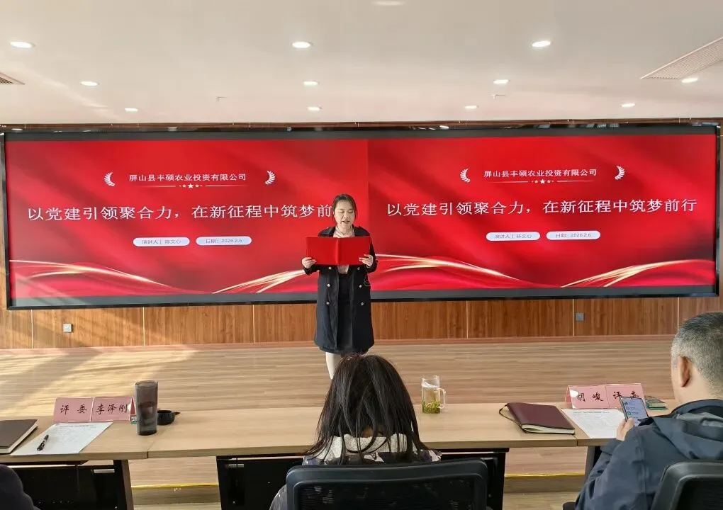 为深入贯彻落实国企改革深化提升行动要求,凝聚全员奋进力量,锚定2026年高质量发展目标,切实将职工个人理想融入企业发展大局,2月6日上午,屏山县丰硕农业投资有限公司党支部、公司行政和工会联合举办“奋进2026·共筑丰收梦”企业文化职工竞技主题演讲比赛。县财政局、县农业农村局、县林竹中心和公司外部董事莅临活动现场指导,公司领导班子及全体职工齐聚现场,共赏奋进风采、共话丰收愿景、共聚发展合力,以演讲传心声、以奋进启新程。