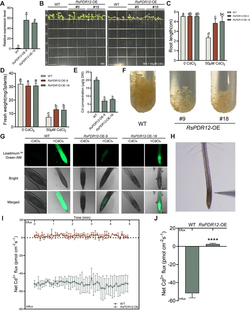 研究团队此前已从萝卜中鉴定出一个受镉胁迫显著诱导的多向耐药性(PDR)基因RsPDR12。通过在拟南芥和酵母中异源表达该基因,研究人员发现过表达RsPDR12能显著减少植株体内镉的累积。进一步借助镉荧光探针染色与非损伤微测(NMT)技术对根系Cd²⁺流进行动态监测和原位可视化分析,结果清晰显示:过表达RsPDR12的根系对镉的内流速率明显下降,整体镉积累水平也随之降低,有力证实了该基因在萝卜中发挥着镉外排泵的功能。