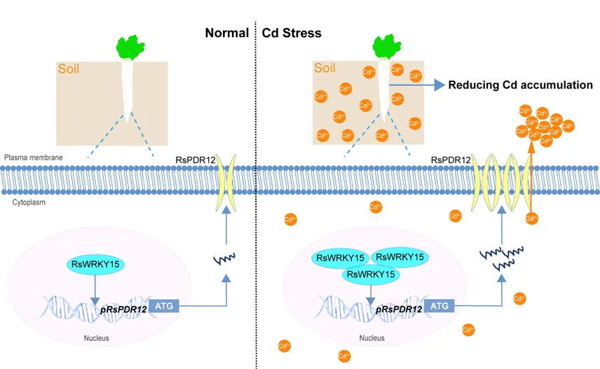 综合上述结果,研究团队构建了一个清晰的分子通路模型:在正常条件下,RsWRKY15维持基础表达水平;当植株遭遇镉胁迫时,RsWRKY15迅速被诱导高表达,并直接激活下游靶基因RsPDR12的转录。后者编码一种镉外排转运蛋白,可将进入细胞的Cd²⁺主动泵出,从而有效降低萝卜整体尤其是肉质根中的镉积累量。这一“RsWRKY15–RsPDR12”模块的发现,不仅阐明了萝卜应对镉毒害的内在防御机制,也为未来培育低镉累积萝卜新品种提供了关键的理论依据与可操作的分子靶点。