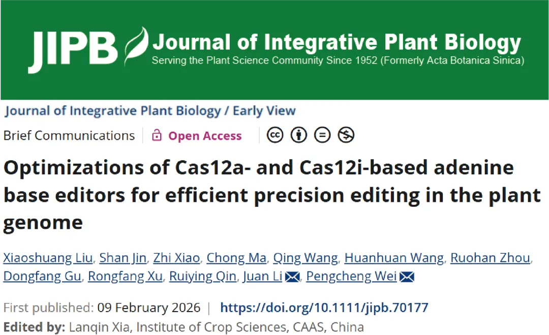 近日, 安徽农业大学联合安徽省农业科学院在JIPB在线发表题为“Optimizations of Cas12a- and Cas12i-based adenine base editors for efficient precision editing in the plant genome”的研究论文 (https://doi.org/10.1111/jipb.70177)。该研究揭示了通过融合高活性核酸酶变体与二聚化 TadA-8e, 能显著提升植物中LbCas12a-ABE和Cas12i3-ABE的碱基编辑效率。