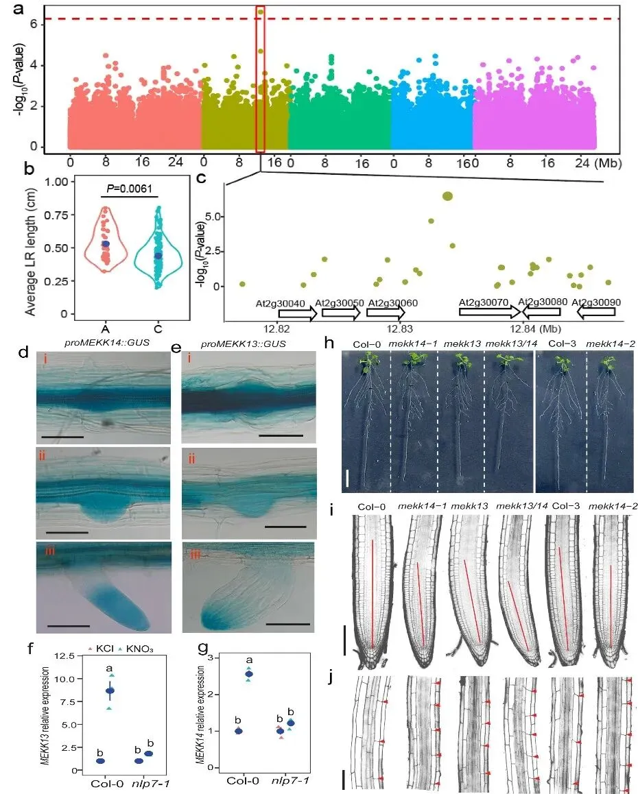 研究团队以侧根长度为表型指标,开展全基因组关联分析,成功定位到MAPKKK14(即MEKK14)基因与侧根发育显著相关。进一步发现,MEKK14与其同源基因MEKK13在侧根发育阶段呈组成型表达,且其转录水平可被硝酸盐迅速诱导——这一过程依赖于细胞内已知的硝酸盐受体NLP7。当MEKK13/14双基因被敲除后,侧根中的细胞分裂与伸长受到明显抑制,导致侧根发育严重受阻。更有意思的是,研究人员通过定点突变发现,MEKK14激酶结构域第172位的组氨酸(His)若被替换为谷氨酰胺(Gln),会显著削弱其激酶活性,并相应降低侧根的伸长能力。