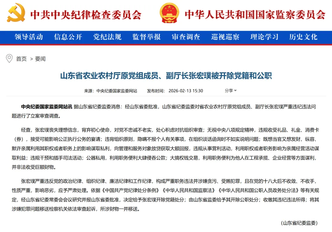 2026年2月,经山东省委批准,山东省纪委监委对省农业农村厅原党组成员、副厅长张宏璞严重违纪违法问题进行了立案审查调查。
