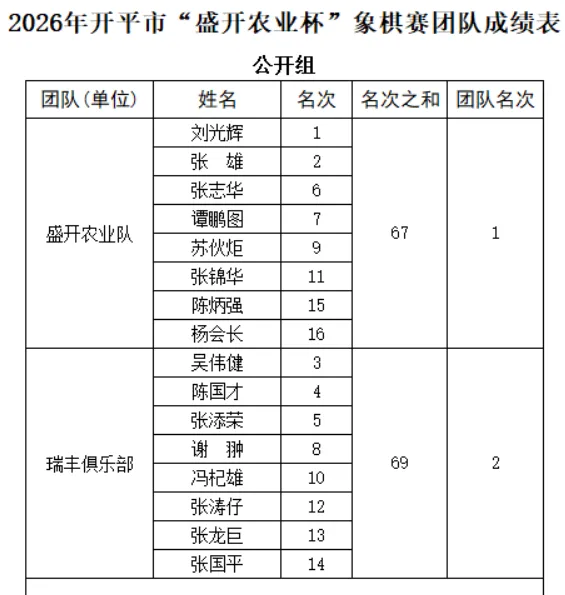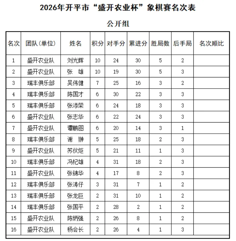 2026年2月14日下午,由苍城盛开农业科技公司主办的“盛开农业杯”中国象棋赛在公司内火热开赛。本次比赛采用团体对抗形式,开平市盛开农业队与瑞丰俱乐部各派出8名棋手,展开五轮电脑积分编排的激烈角逐。每轮比赛单方用时10分钟包干,胜积2分、和积1分,同队队员避让,确保对决公平公正。