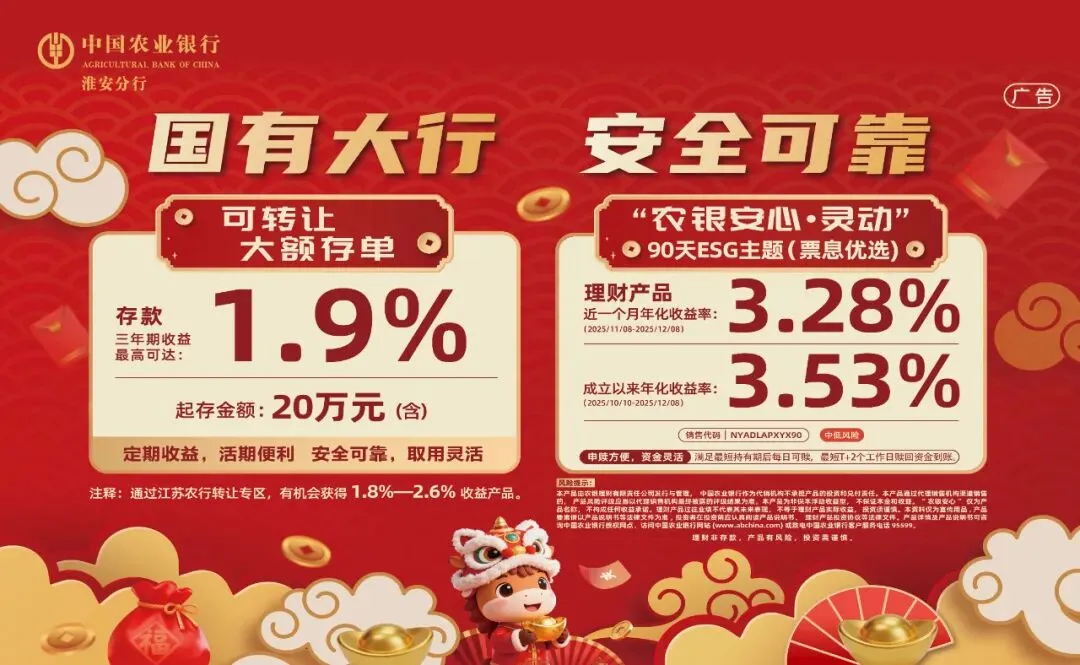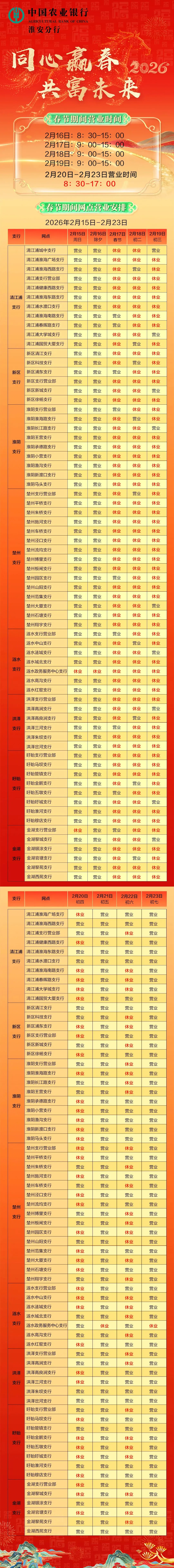 >农行淮安分行2026年春节期间网点营业时间