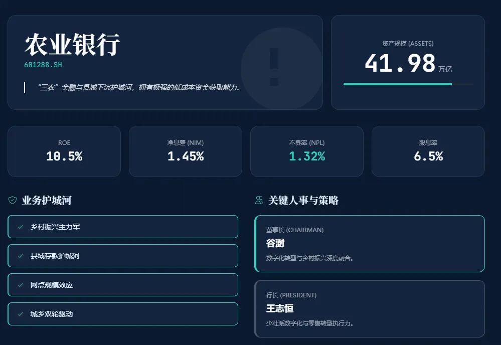 农行的核心护城河在于其 “三农”金融 与 广阔的县域网络 。