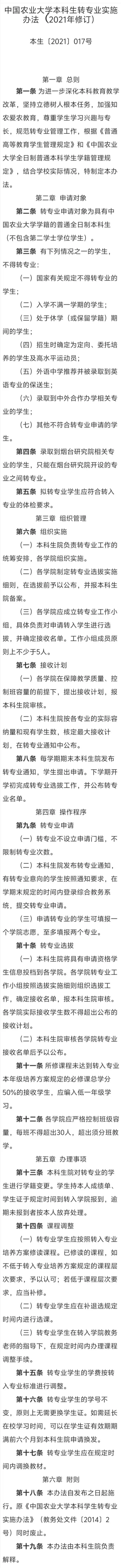 《中国农业大学本科生转专业实施办法(2021年修订)》于2021年11月29日发布,同一天也发布了《关于规范本科生涉农专业转专业的若干举措》。为培养知农爱农新型人才,学校要强化涉农专业认知教育,减少盲目转专业。设置涉农学院净转出上限,涉农学院净转出人数一般不得超过当年学生数的35%。推免计划适度向涉农专业倾斜。