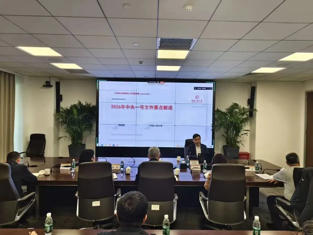 2026年2月10日,应中国农业再保险邀请,我院程国强教授出席第六期“农再讲堂”,并以“2026年中央一号文件要点解读”为题作专题讲座。中国农业再保险党委书记、董事长李有祥主持讲座,公司领导班子、全体干部职工及部分直保公司代表通过现场或视频方式参加讲堂学习。