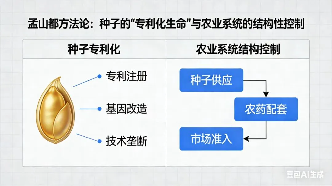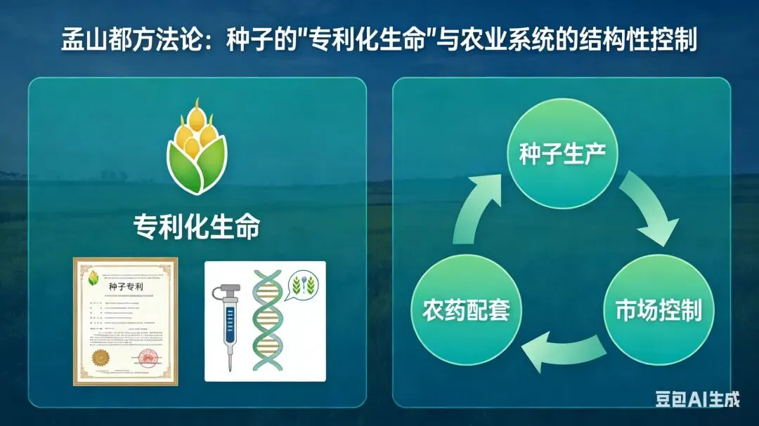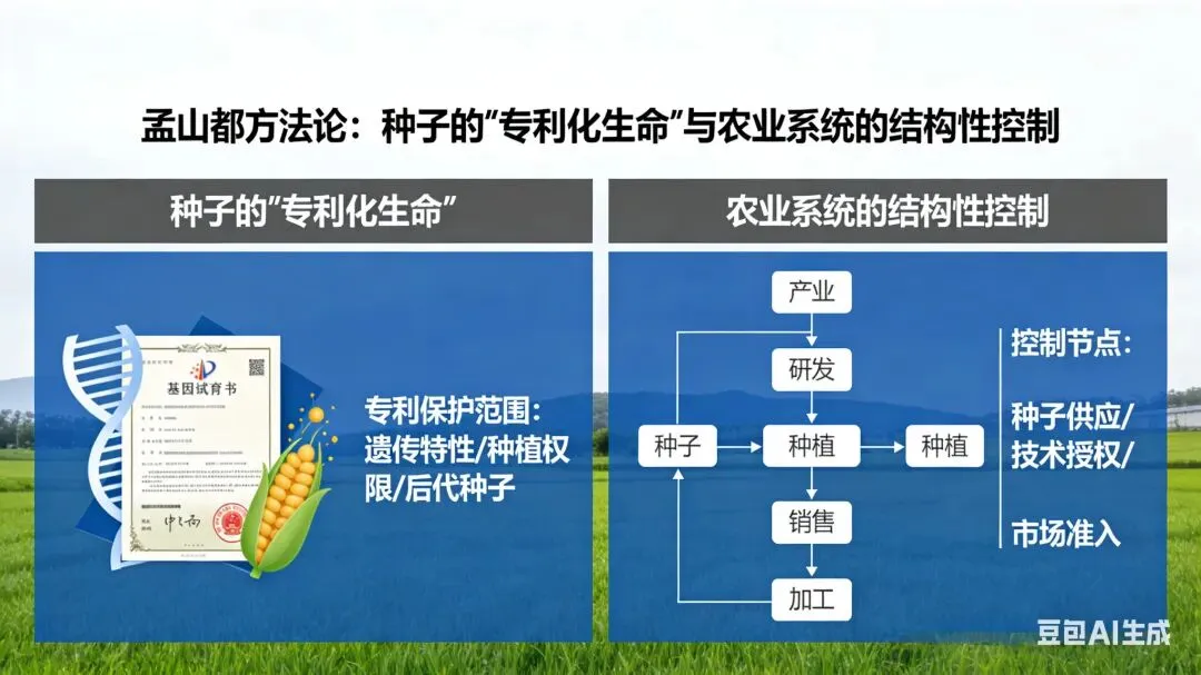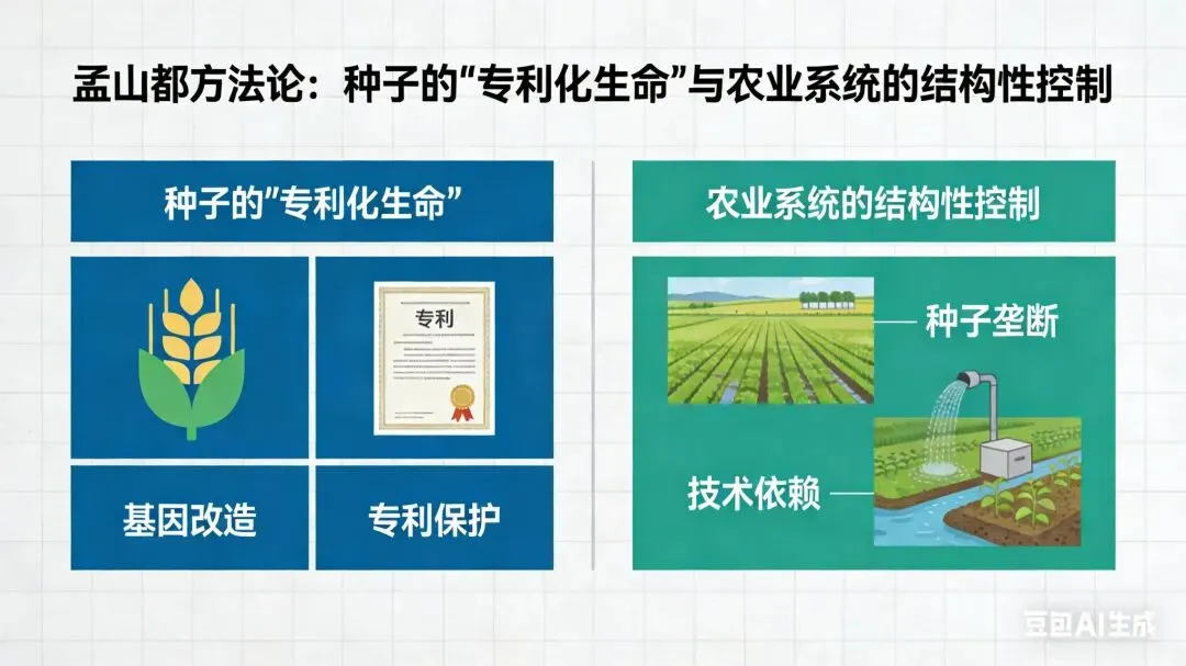 孟山都方法论的基础,是运用现代生物技术和知识产权法律,对生命本身进行“再定义”和“再编码”,使其成为可被私有化控制的资产。