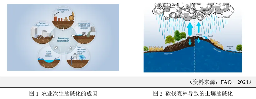 由于森林砍伐和深根植被向浅根作物的转变,土壤会发生盐碱化。这种作物转型改变了景观的水文格局,导致蒸散量减少和地下水补给增加(秦金波,2024)。地下水位上升导致地下层所含盐分活化并带至地表(图2)。如澳大利亚西南部在1970年有过200万公顷的土地受到此类转型的影响,从而引发了全国性的旱地盐碱控制计划。2003年仍有超过180万公顷的土地受到盐碱影响,到2050年,可能面临风险的土地面积将达到880万公顷(Hatton et al.,2003)。在其他地区,如阿根廷、巴拉圭、玻利维亚的干旱查科地区(Maertens,2021;Maertens et al.,2022)以及泰国(Miura et al.,1991)也报告了因森林砍伐导致的土壤盐碱化现象。