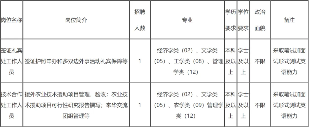 农业农村部国际交流中心是农业农村部直属事业单位,主要职能是为农业国际合作交流工作提供外事支撑保障服务。因工作需要,拟面向社会公开招聘2名编制外工作人员。现将有关事宜公告如下: