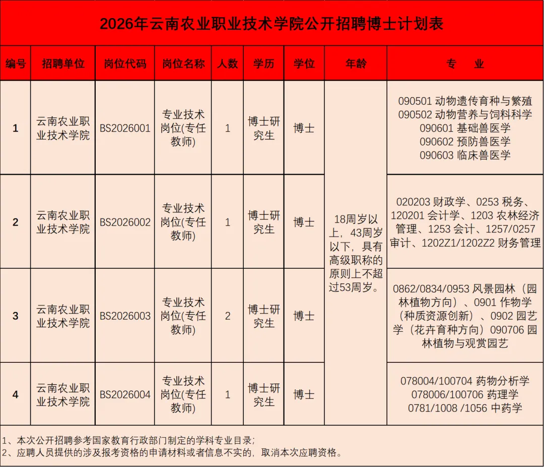 按照《事业单位公开招聘人员暂行规定》(人事部令第6号)《云南省事业单位公开招聘工作人员办法》(云人社发〔2016〕182号)等法律法规,根据工作需要,经云南省教育厅审核同意报云南省人力资源和社会保障厅核准,2026年云南农业职业技术学院面向社会公开招聘博士5名,现将有关招聘事宜公告如下。