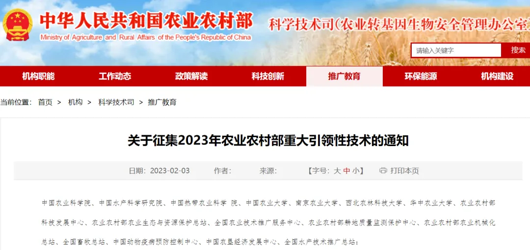为贯彻落实党的二十大、中央经济工作会议和中央农村工作会议精神,充分发挥科技集成创新在引领农业高质高效发展和支撑农业强国中的重要作用,我部决定组织征集2023年农业农村部重大引领性技术(以下简称“引领技术”),并通过打造集成示范样板促进技术成果转化落地,推动农业提质增效。现就有关事项通知如下。