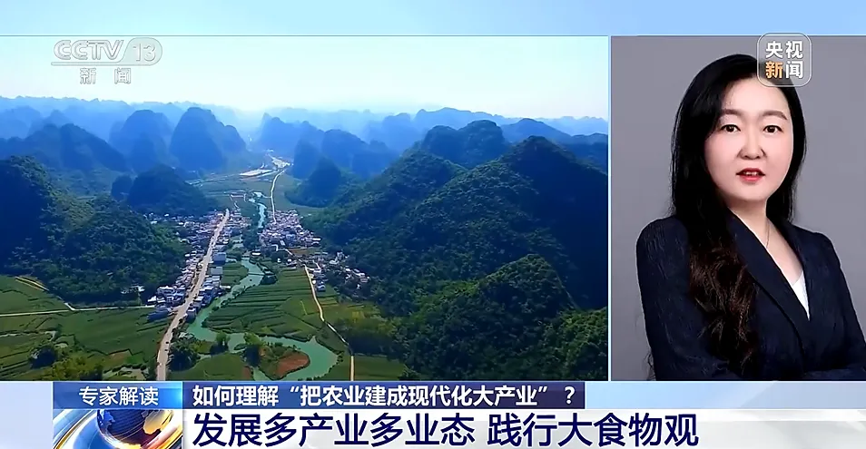 姜楠:这里可以看出来农业的内涵更加丰富了,产业体系也更加完整了,这样我们的农产品附加值也会更高。那么怎么才能把农业建成现代化的大产业呢?一方面就是要发展多产业多业态,践行大食物观,像森林、草原、江河湖海要食物,构建多元化的食物供给体系。另一方面是促进全产业的发展。我们现在不仅要发展一产的种植业、养殖业,还要发展二产的农产品加工业和三产的服务业,这样才能促进农产品多样化的开发,提高农业的质量效益。