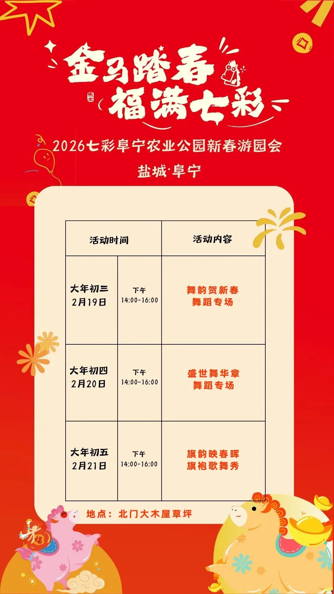 年味正浓,马蹄声近。2026马年春节,七彩阜宁农业园「金马踏春 福满七彩」新春游园会重磅来袭!正月初三到初五,精彩演出轮番上演,马年美陈打卡氛围拉满,趣味互动游戏嗨玩不停,邀您和家人共赴一场热闹新春盛宴!