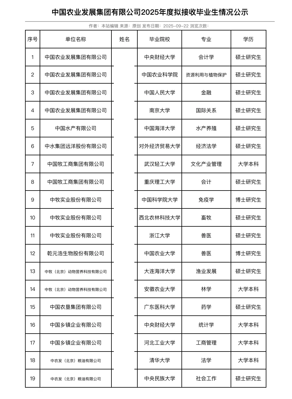 本期分享的是中国农业发展集团有限公司2025年度拟接收毕业生情况公示