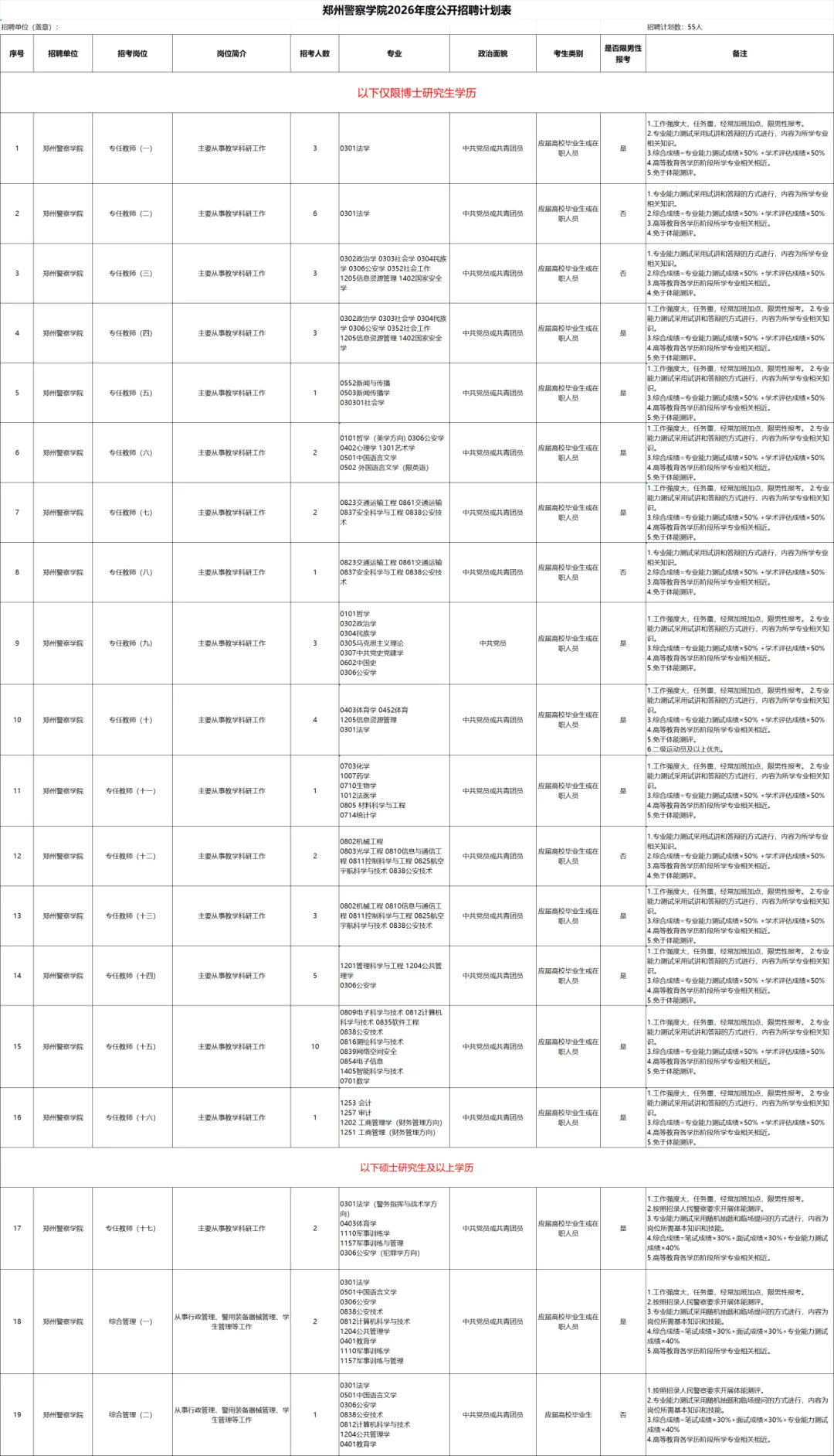 本次招聘共设置19个职位、拟招聘55人,均为学院在编人民警察。具体职位信息及资格条件详见《郑州警察学院2026年度公开招聘计划表》