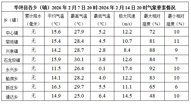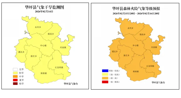 本周我县以晴或少云天气为主,昼夜温差大,白天紫外线强,有局地大风。本周华坪国家基本气象站平均气温14.8℃,较常年同期偏高0.2℃,属正常;累计日照68.5小时,较常年同期偏多9.9小时,属正常;本周无降水,较常年同期偏少0.7毫米,偏少100%。今年截至2月14日20时,华坪国家基本气象站无降水,较常年同期偏少8.7毫米,偏少100%。据云南省气候中心2月14日监测(见下图左),我县为轻度气象干旱;2月15日森林草原火险气象等级为二级(高)(见下图右)。