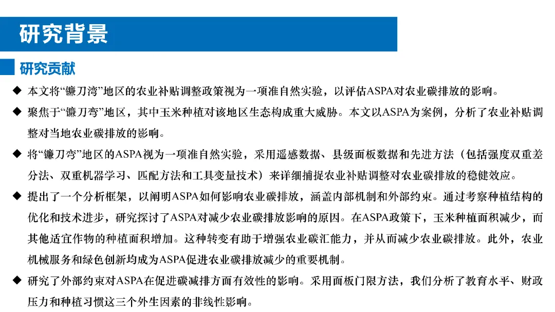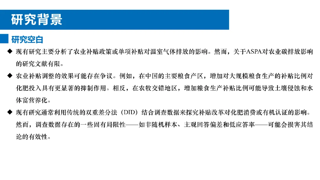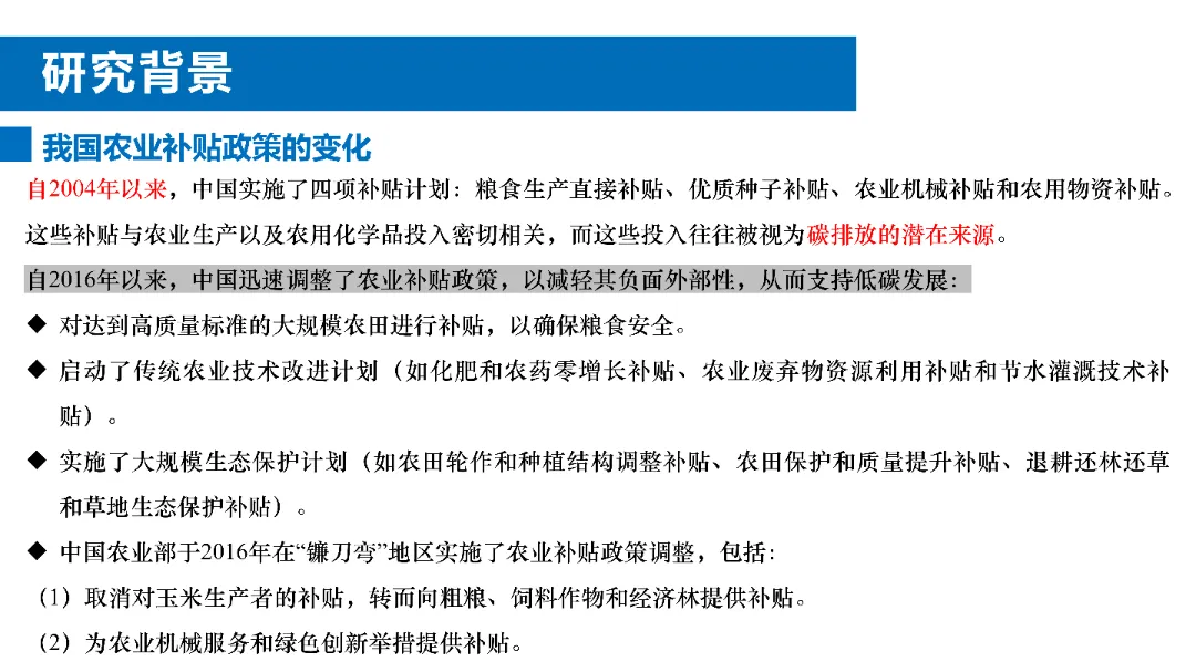 论文引用:Zhang, Zhuang, et al. "Effects of agricultural subsidy policy adjustment on carbon emissions: A quasi-natural experiment in China." Journal of Cleaner Production 487 (2025): 144603.