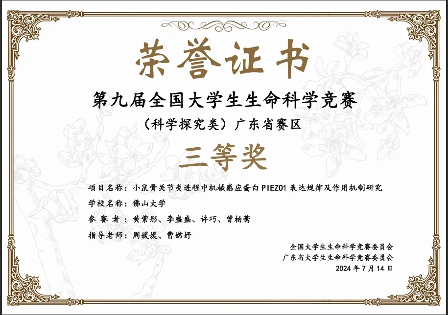 科研路上,她是潜心钻研的探索者。作为一名生物工程专业的学子,许巧始终聚焦学术前沿,深耕 osteoarthritis 治疗领域。她参与完成的 SCI 论文《A Novel Thermosensitive Curcumin-Loaded Hydrogel That Modulates Macrophage M1/M2 Polarization for Osteoarthritis Therapy》,以创新视角为疾病治疗提供了新思路,展现了扎实的专业功底与科研创新能力。在大学生生命科学竞赛中,她与团队并肩作战,历经无数次实验打磨与方案优化,最终斩获广东省三等奖,用实力书写了青春奋斗的篇章。