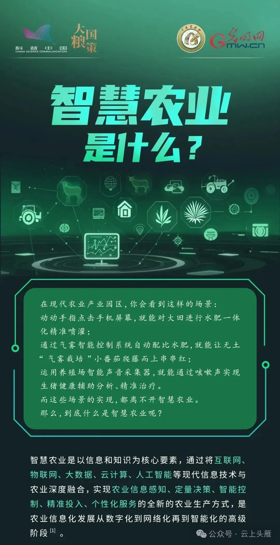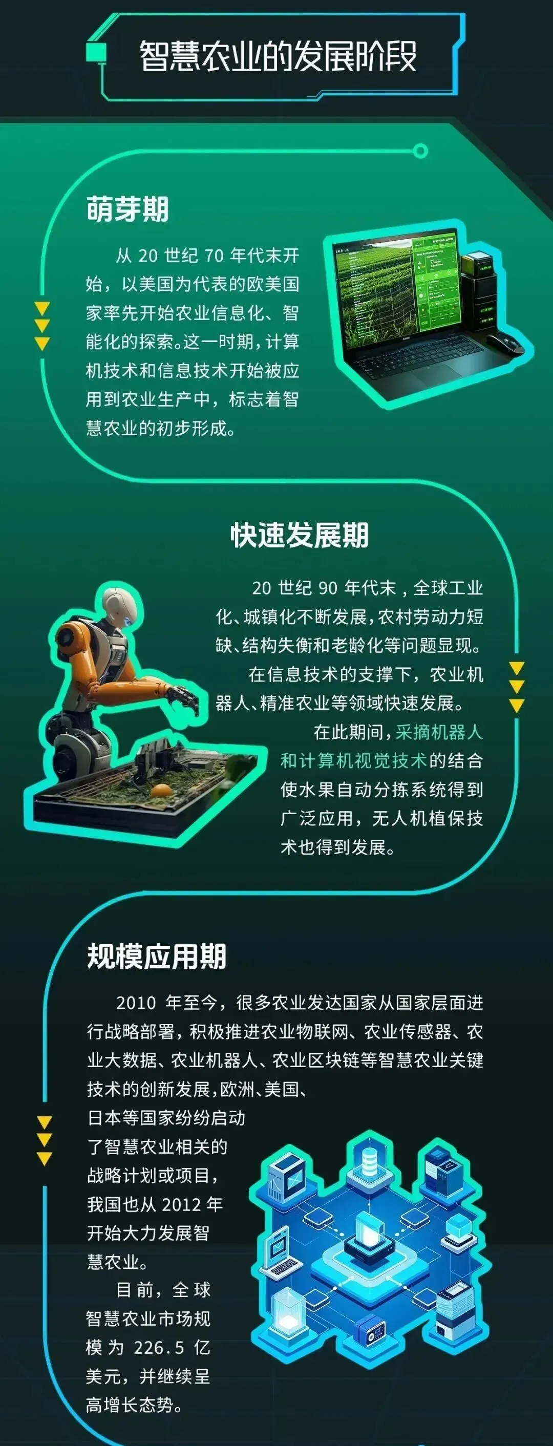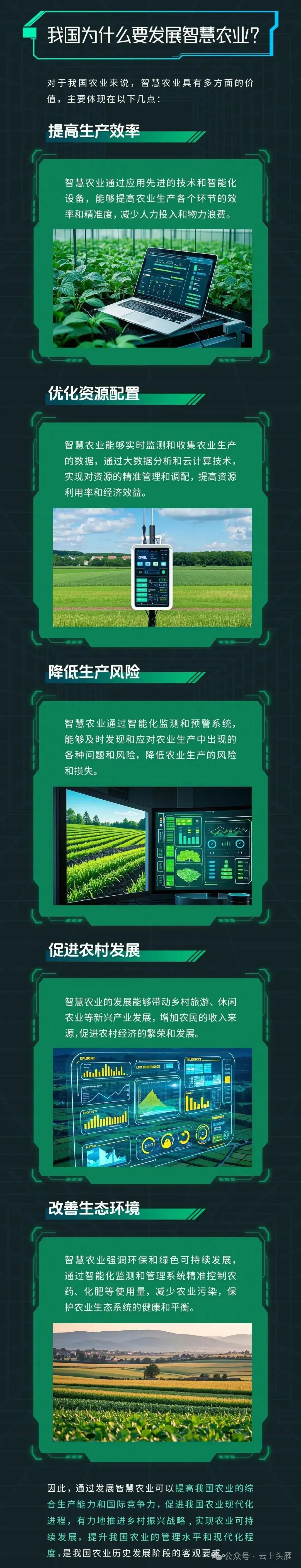 总之,智慧农业是信息技术与农业融合的产物,已走过萌芽到规模应用的发展阶段,成为农业现代化的核心方向。它通过精准、智能手段提升生产效率、优化资源配置,覆盖农业全产业链,还能带动农村经济、守护生态环境。未来,随着技术不断创新普及,智慧农业将持续破解传统农业难题,为乡村振兴和粮食安全保驾护航,推动农业高质量发展。